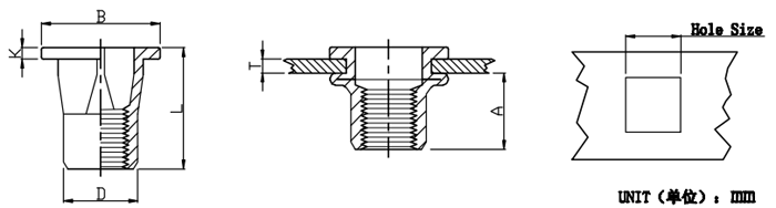 Thread P/N T(GRIP RANGE) A Hole Size D B K L Min Max Ref +0.1 +0.07 ±0.25(*±0.3) ±0.1(*±0.15) ±0.25(*±0.3) 0 -0.1 M5*0.8 FH-SQB-0420 0.5-1.5 8.0 7.0 5.9 10.5 0.6 11.2 M5*0.8 FH-SQB-0530 1.5-3.0 8.0 7.0 6.9 10.5 0.6 12.7 M6*1.0 FH-SQB-0625 0.5-2.5 8.5 9.0 8.9 14.0* 0.8* 14.3 M6*1.0 FH-SQB-0640 2.5-4.0 9.5 9.0 8.9 14.0* 0.8* 17.2* M8*1.25 FH-SQB-0830 1.0-3.0 11.5 11.0 10.9 17.5* 1.3* 18.6*