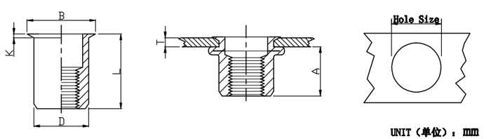 Thread P/N T(GRIP RANGE) A Hole Size D B K L Min Max Ref +0.1 ±0.05(* +0.06 ) 0 -0.1 M3*0.5 RH-RB-UK-0315 0.5-1.5 5.5 4.8 4.65 5.4 +0.3 0.4±0.1 9.0±0.2 -0.1 M4*0.7 RH-RB-UK-0420 0.5-2.0 6.5 6.4 6.25 7.0 +0.3 0.5±0.1 10.5±0.25 -0.1 M5*0.8 RH-RB-UK-0525 0.5-2.5 7.5 7.2 7.05 7.8 +0.3 0.5±0.1 12.0±0.25 -0.1 M6*1.0 RH-RB-UK-0630 1.0-3.0 9.2 9.6 9.45 10.3 +0.3 0.6±0.15 15.0±0.3 -0.1 M8*1.25 RH-RB-UK-0835 1.0-3.5 10.5 10.6 10.45 11.3 +0.35 0.6±0.15 16.0±0.3 -0.1 M10*1.5 RH-RB-UK-1040 1.0-4.0 12.8 12.8 12.65* 13.8 +0.35 0.65±0.15 20.0±0.3 -0.1
