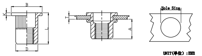 Thread P/N T(GRIP RANGE) A Hole Size D B K L Min Max Ref +0.1 +0.07 ±0.3(*±0.25) ±0.15(*±0.1) ±0.3(*±0.25) 0 -0.1 M4*0.7 FH-KB/AL-0420 0.5-2.0 6.0 6.0 5.9 8.8* 0.8* 10.5* M5*0.8 FH-KB/AL-0525 0.5-2.5 7.5 7.0 6.9 10.0 1.0 13.0 M6*1.0 FH-KB/AL-0625 0.5-2.5 9.2 9.0 8.9 12.3 1.5 15.0 M8*1.25 FH-KB/AL-0830 1.0-3.0 10.2 11.0 10.9 14.3 1.5 16.5 M10*1.5 FH-KB/AL-1040 1.0-4.0 11.5 13.0 12.9 16.3 1.6 19.0